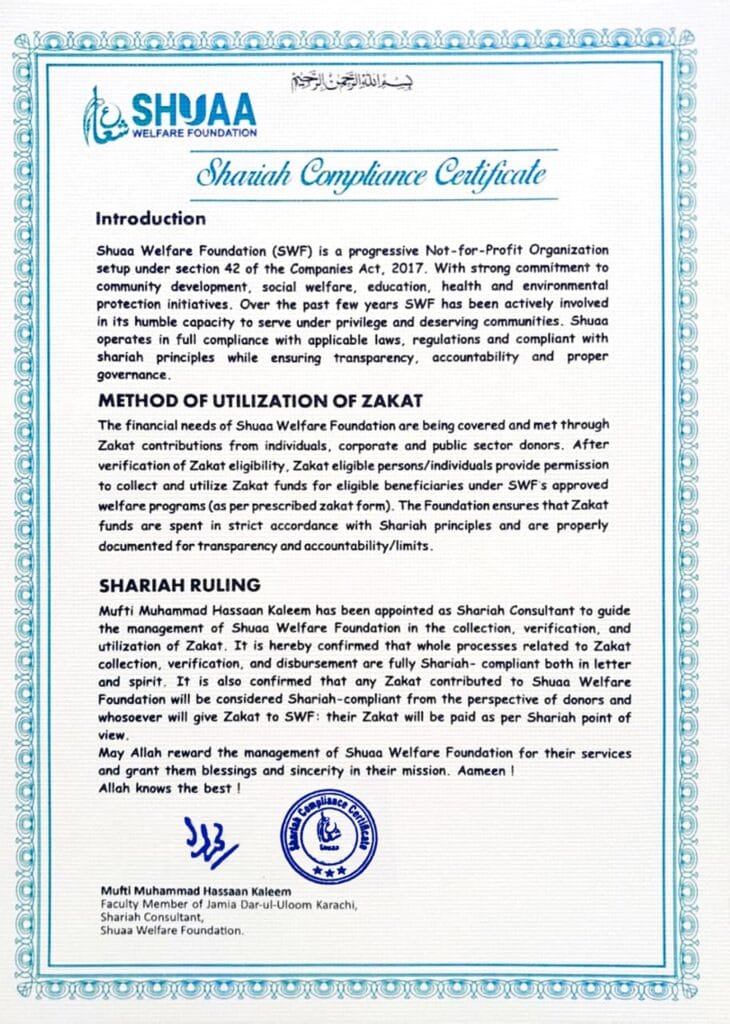 Shuaa Welfare Foundation operates within the legal and regulatory framework governing charities in Pakistan. The organization holds official registration under the relevant authorities, ensuring transparency and compliance in its welfare activities.
