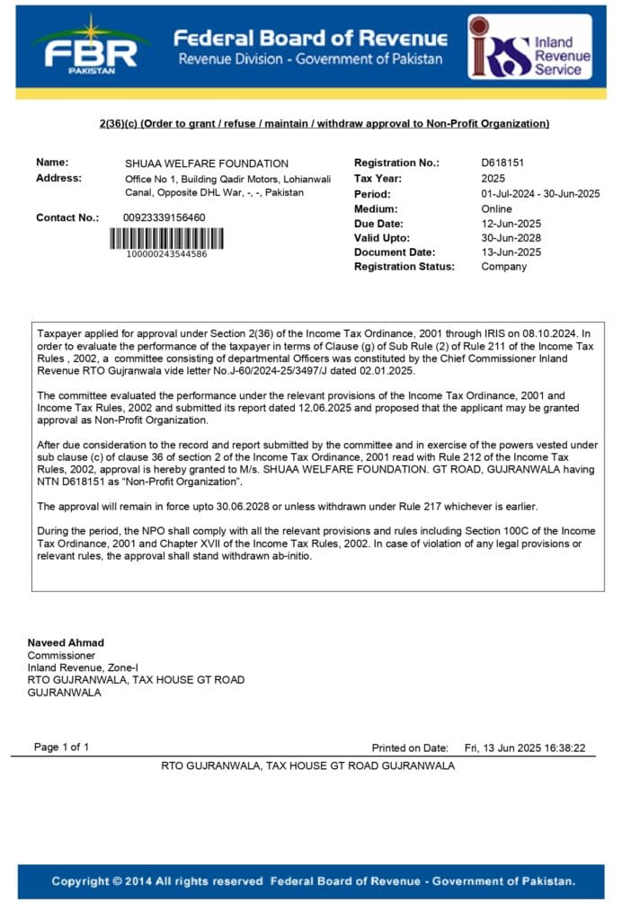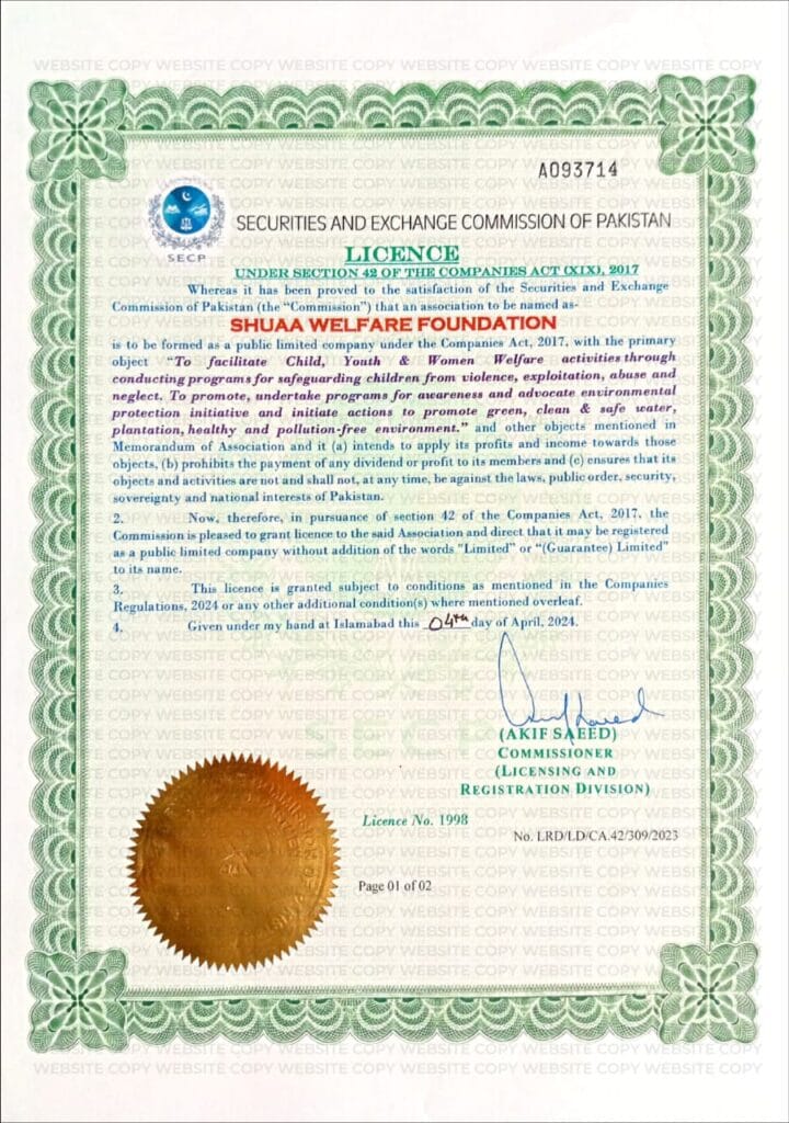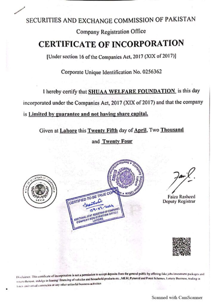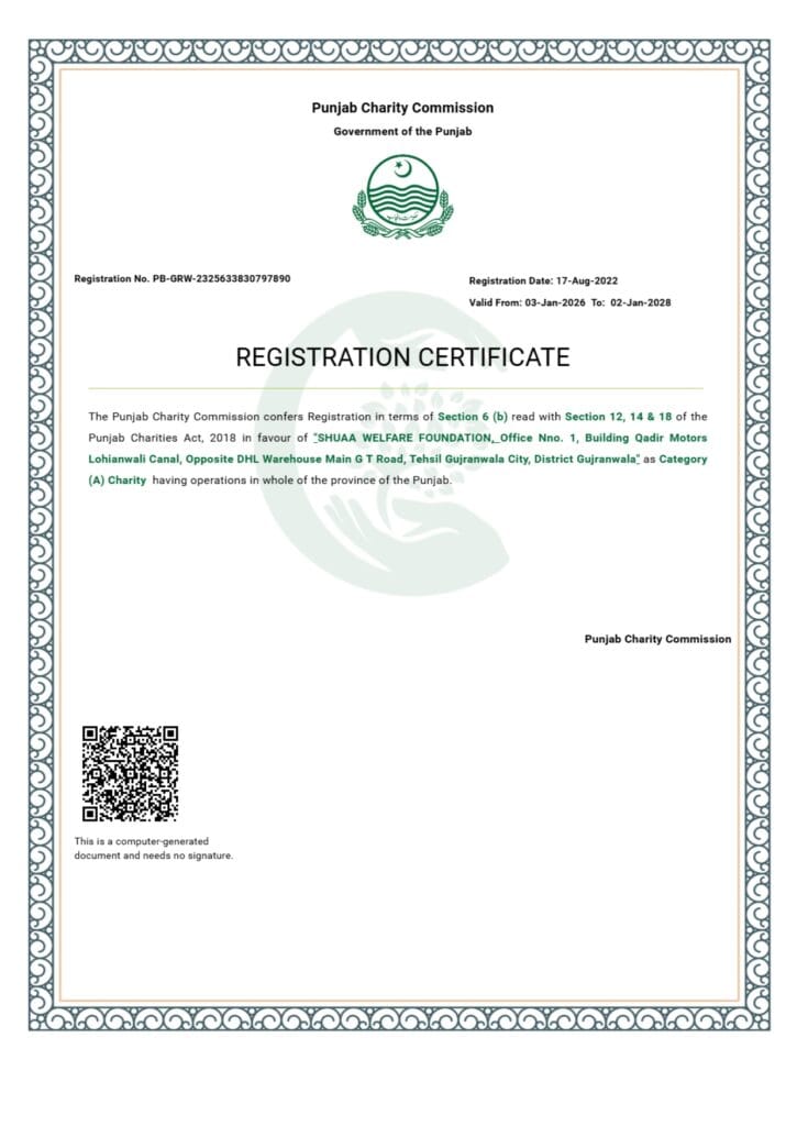 Shuaa Welfare Foundation operates as a legally registered not-for-profit organization and carries out its activities in compliance with applicable laws and regulatory requirements. The Foundation has obtained the necessary approvals and certifications from relevant government authorities to conduct its welfare, educational, and environmental initiatives.